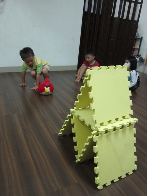 1、「衝吧!憤怒鳥!」:利用幾塊巧拼組合成堡壘,讓孩子瞄準之後做踢、打、投扔的方法把目標撞倒。最符合原始憤怒鳥的遊戲模式,也可以藉機訓練孩子的肌肉操控與判斷能力喔!