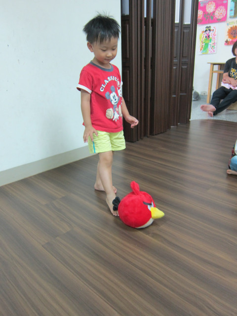 4、「憤怒鳥的反擊」:利用憤怒鳥當靶,訓練孩子用踢或是拍打目標物,但是隨時憤怒鳥會生氣的反擊喔!當家長喊「小心!」並且讓憤怒鳥往他臉上飛去,假如反應慢,就會被憤怒鳥打到啦!