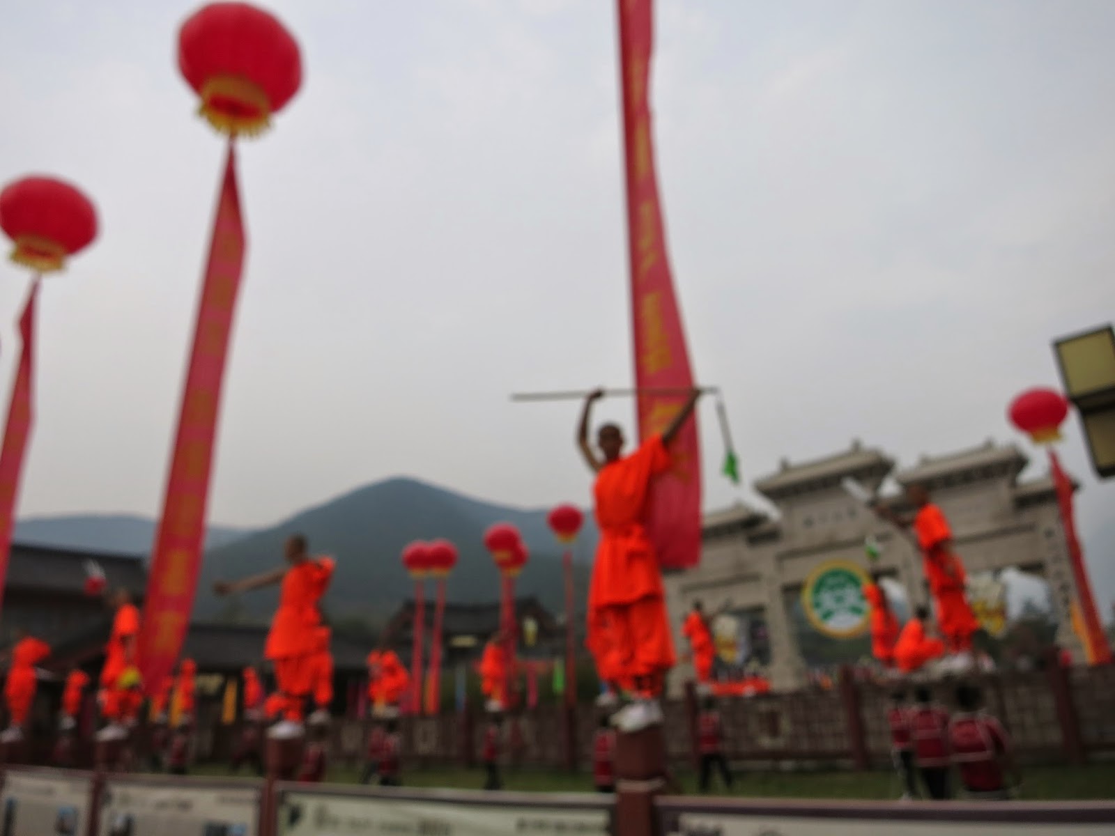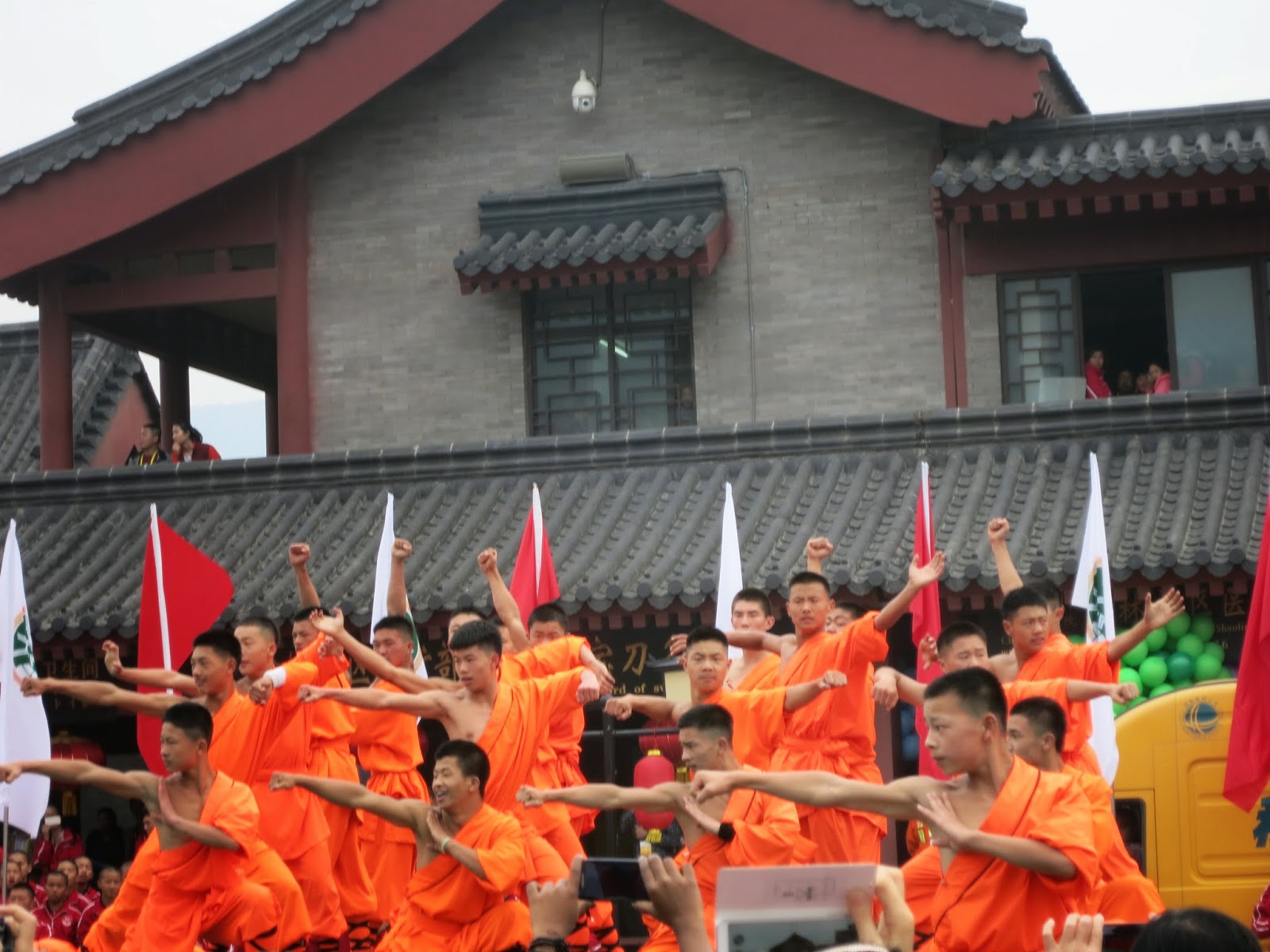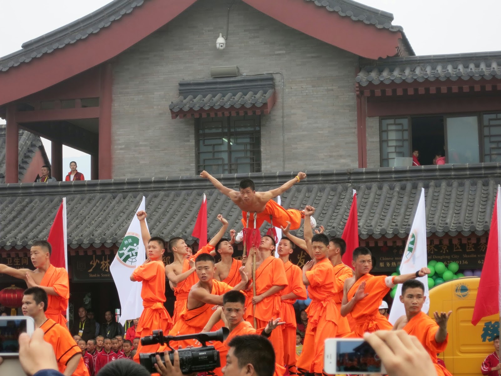 一瞬間旁邊放滿了五彩的氣球並且隨著眼前的長官先行走向少林寺本院時立刻台前也衝出一票表演團隊,非常聰明的讓大家可以避免與這些長官立刻撞上,又不會讓我們原地等太久。