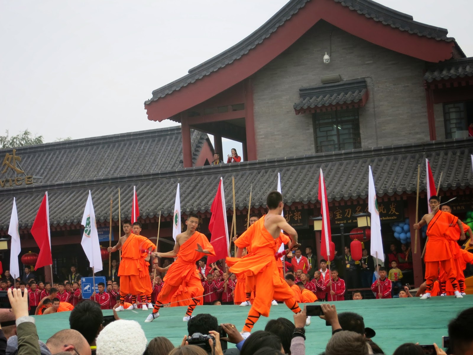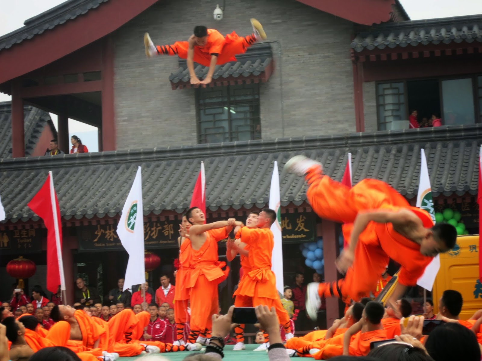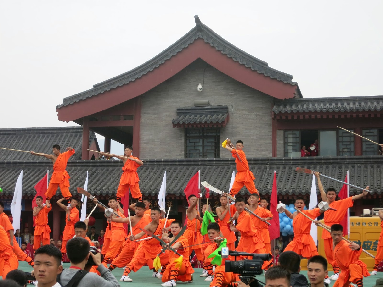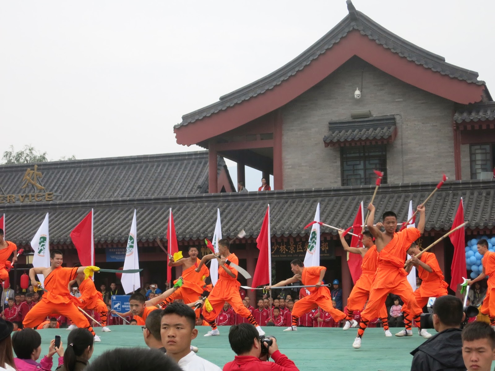 一瞬間旁邊放滿了五彩的氣球並且隨著眼前的長官先行走向少林寺本院時立刻台前也衝出一票表演團隊,非常聰明的讓大家可以避免與這些長官立刻撞上,又不會讓我們原地等太久。