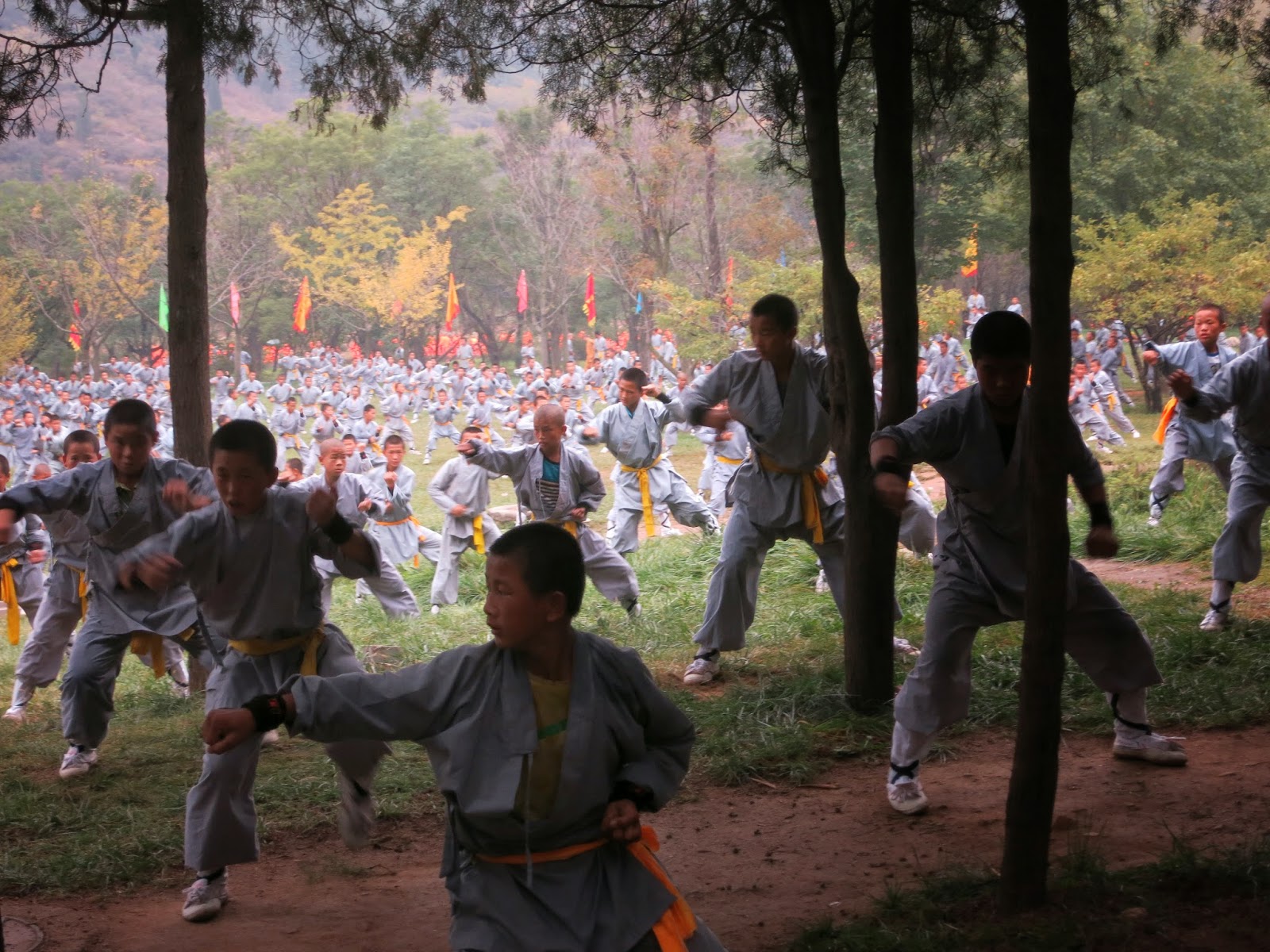 一組整體表演大概是二十分鐘吧?他們不僅打拳也打出十八般兵器,更展現了童子功、鐵槍刺身等等的雜技。我若沒有記錯,從走進會場到活動正式開始引導大家走往少林寺中間他們整整連續表演了將近四場。也就是起碼一個多小時持續的重複動作。